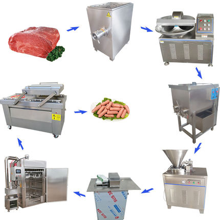 Machine de découpe de viande congelée → Hachoir à viande congelée → Coupe-bol à viande → Mélangeur à farce de viande → Remplisseur de saucisses → Four fumé à la saucisse